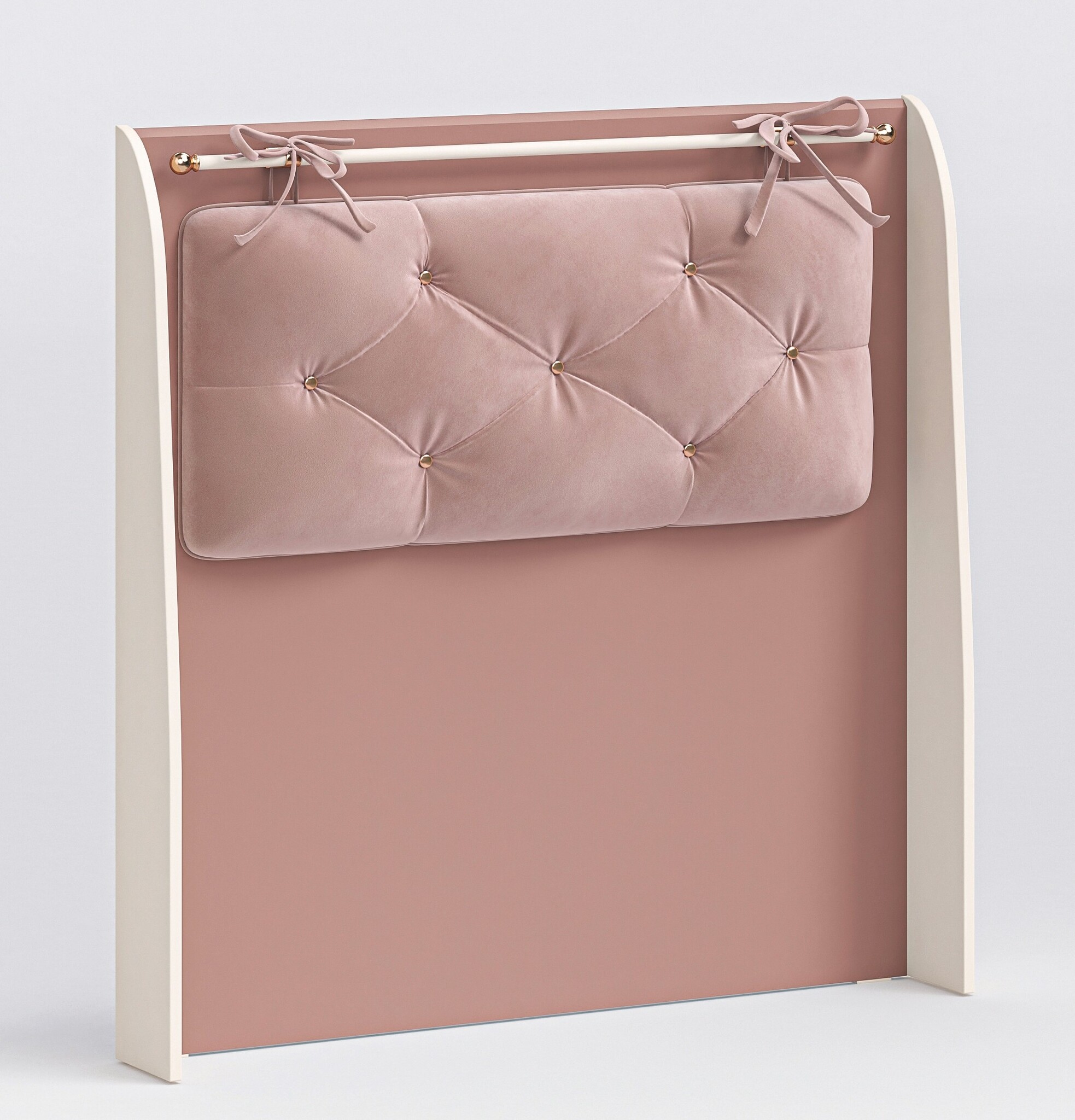 Het hoofdbord is voorzien van een gestoffeerd kussen met elegante knopen en lusjes waarmee het eenvoudig aan de goudgekleurde stang bevestigd wordt. Dit zorgt niet alleen voor een luxe uitstraling, maar ook voor extra comfort: je kind kan er heerlijk tegenaan zitten tijdens lezen, huiswerk maken of ontspannen.