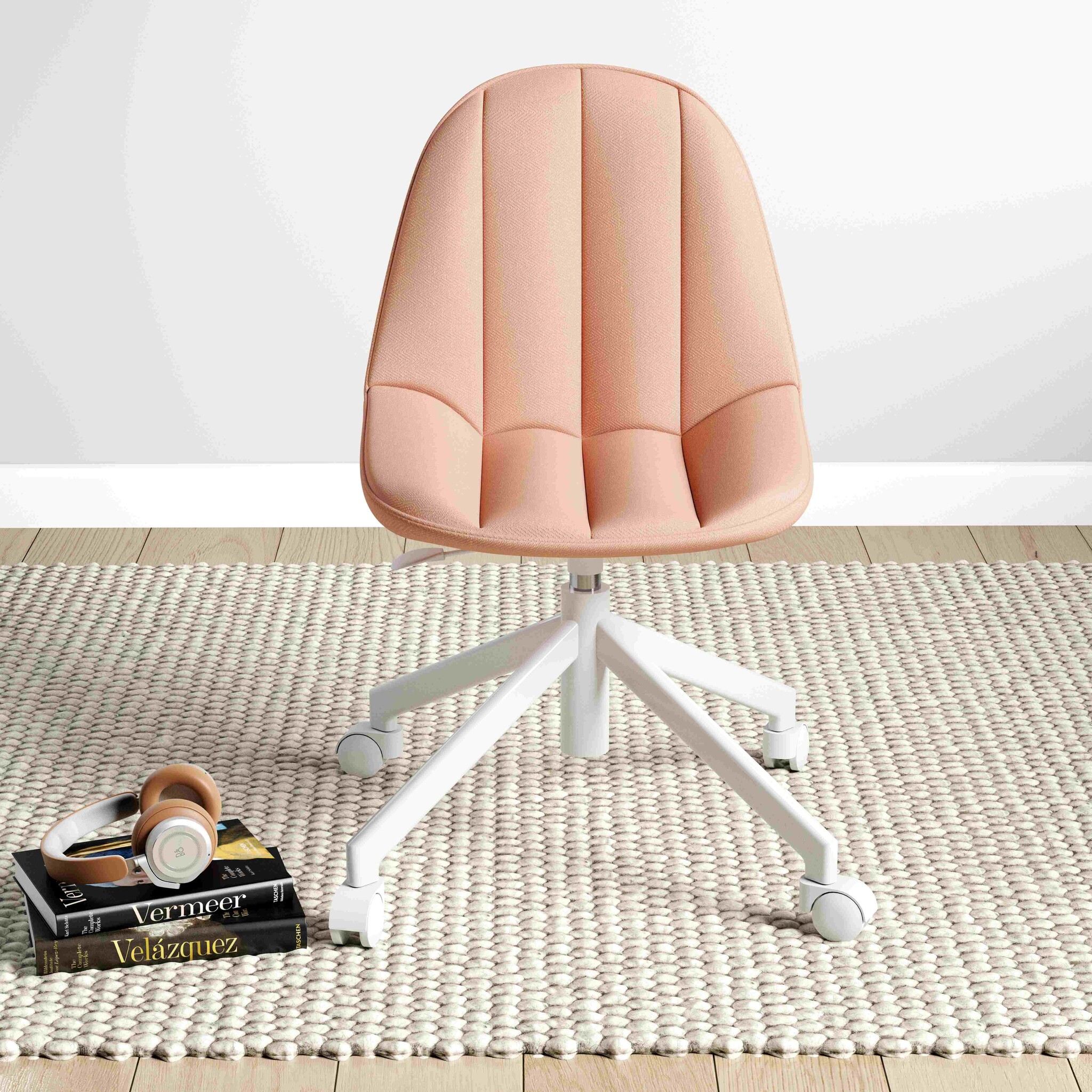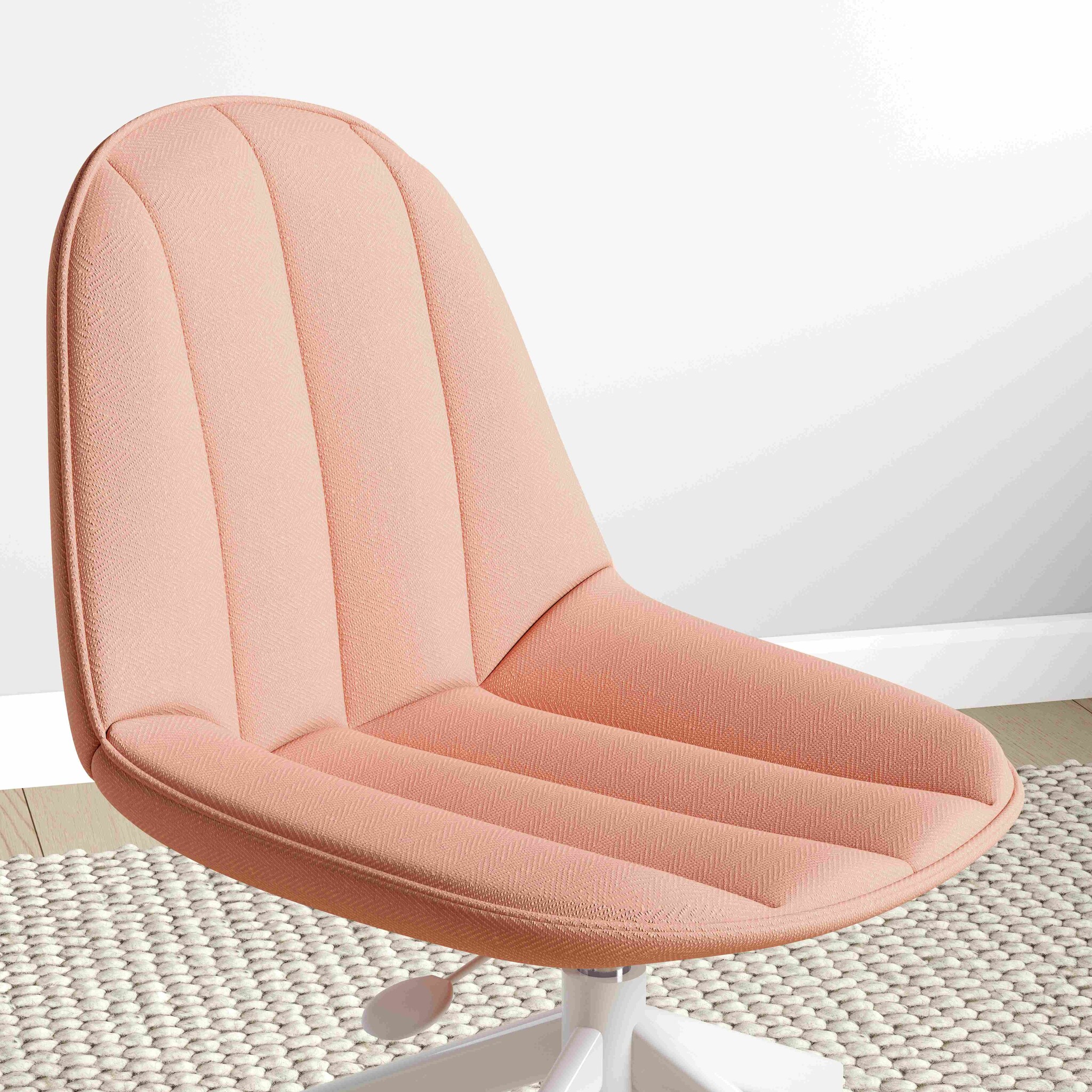 Mode bureaustoel voor de stoere slaapkamer. De zitting en rugleuning hebben zacht schuim en zijn bekleed met zalmroze linnen stoffering. De stervormige poten hebben kunststof wielen met 360 graden rotatiemechanisme. De stoel is in hoogte verstelbaar en heeft een schokdemper. Mooi te combineren bij de bureaus van de Rustic of Romantic kinderkamer.