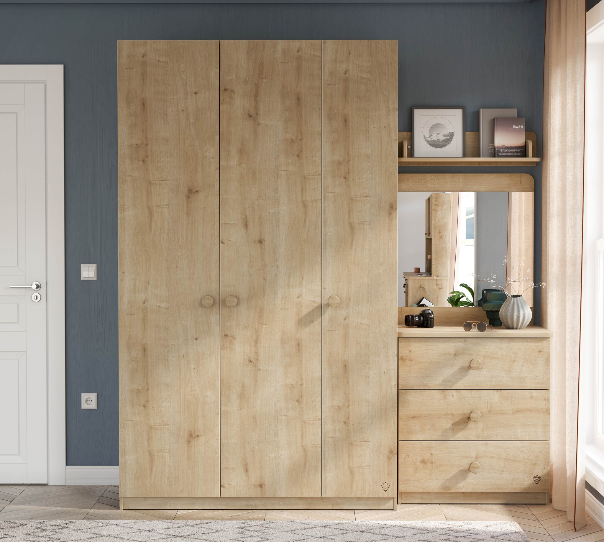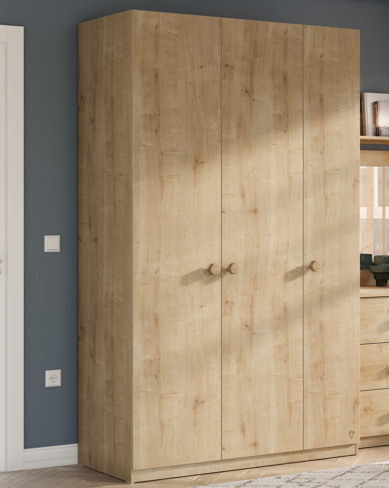De Stockholm 3-deurs kledingkast is een praktische en stijlvolle kast voor de kinderkamer of tienerkamer. Dankzij de neutrale kleur en houtlook past deze kast perfect in elk interieur. De drie deuren zijn voorzien van een softclose systeem, waardoor ze geruisloos sluiten. De kast is uitgerust met een ruim hang- en leggedeelte, zodat kleding en accessoires overzichtelijk kunnen worden opgeborgen.