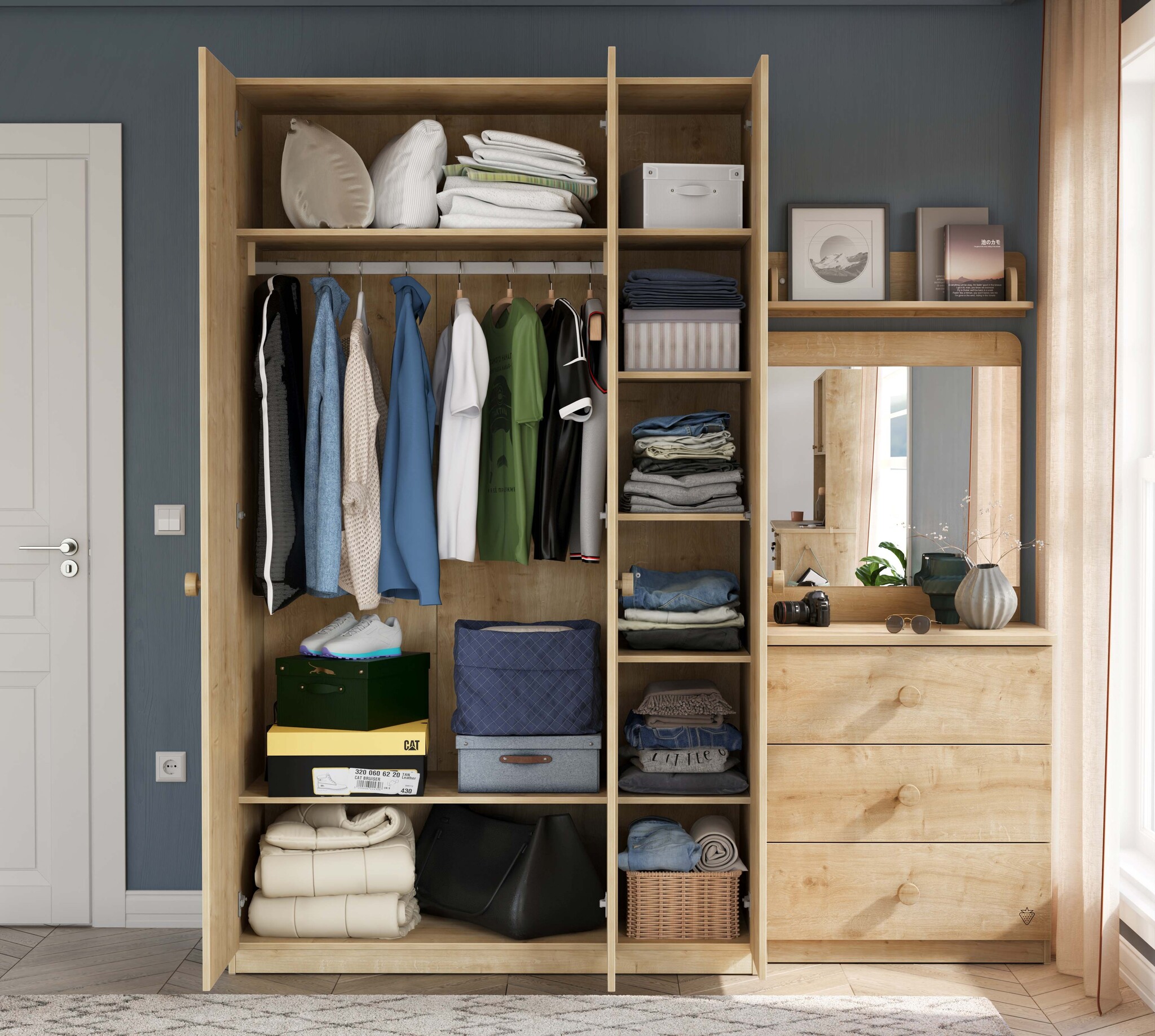 De kast heeft een rustige, natuurlijke uitstraling dankzij de combinatie van neutrale tinten en houtlook. Hierdoor past hij in diverse slaapkamerstijlen. De hoogwaardige afwerking draagt bij aan de duurzaamheid en maakt deze kast een betrouwbare keuze voor jarenlang gebruik.