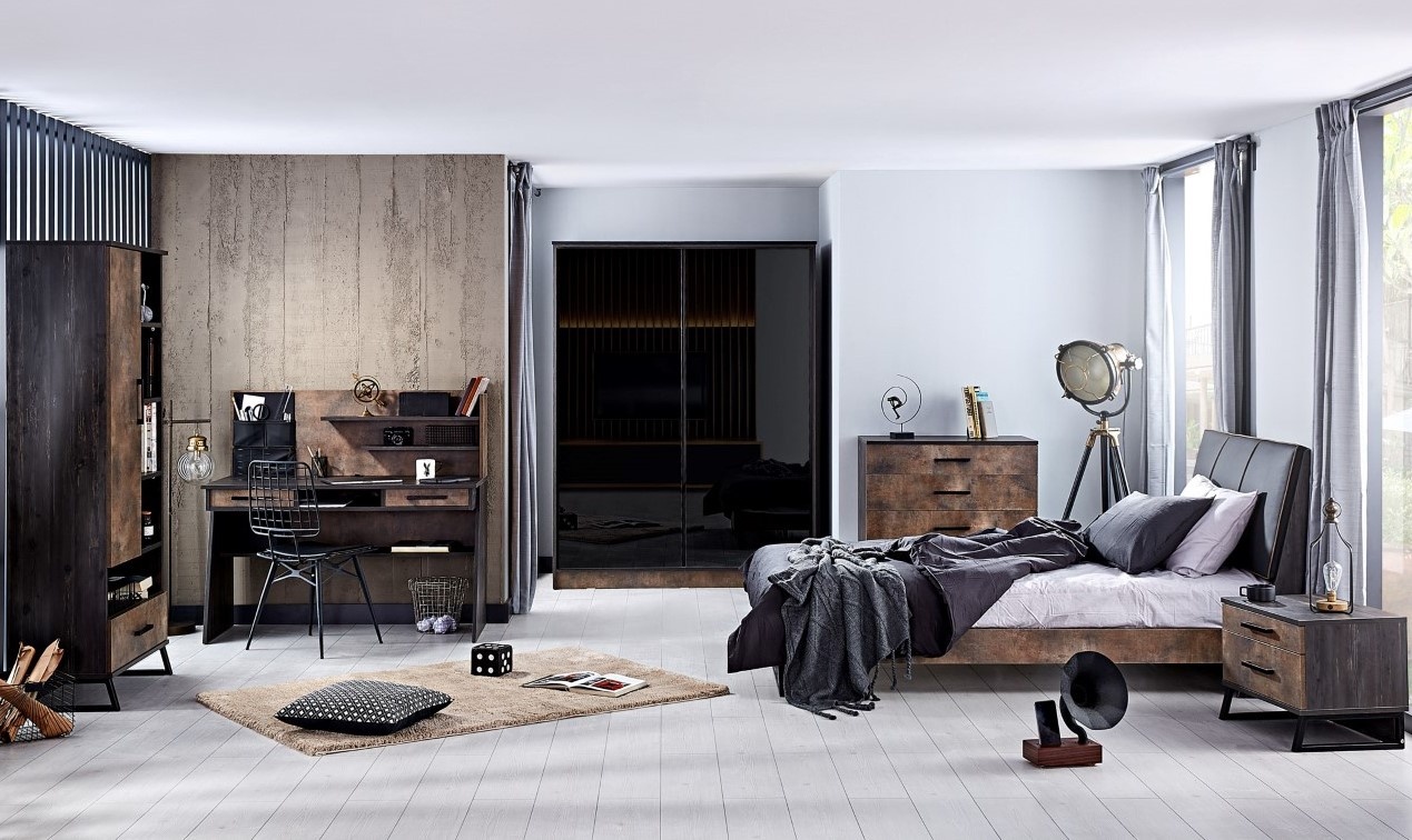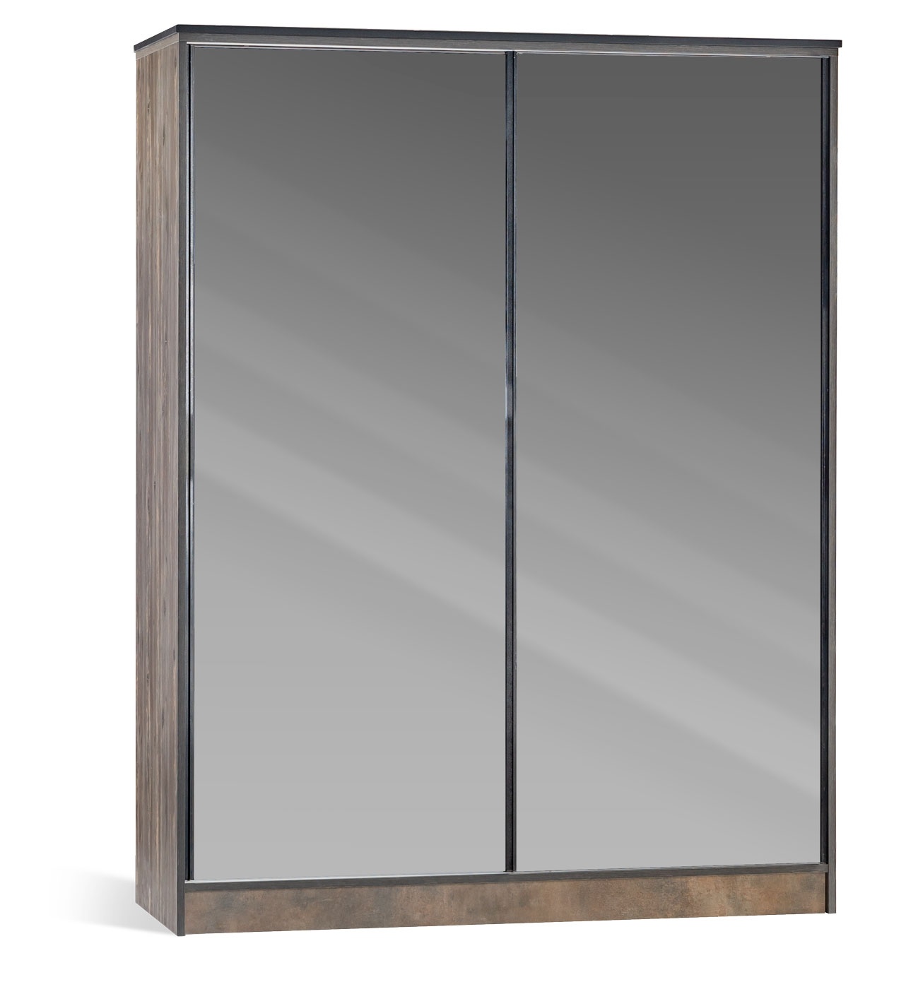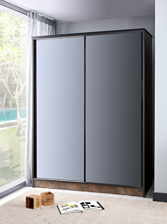 Trento 2-deurs kledingkast schuifdeur industrieel tienerkamer. De kast heeft twee grote donkere spiegel schuifdeuren. De kast heeft zowel een hang als leggedeelte en is voorzien van 2 laden. Trento industrieel tienerkamer een complete slaapkamer met industriële meubels. De meubels zijn antraciet van kleur gecombineerd met houten elementen.