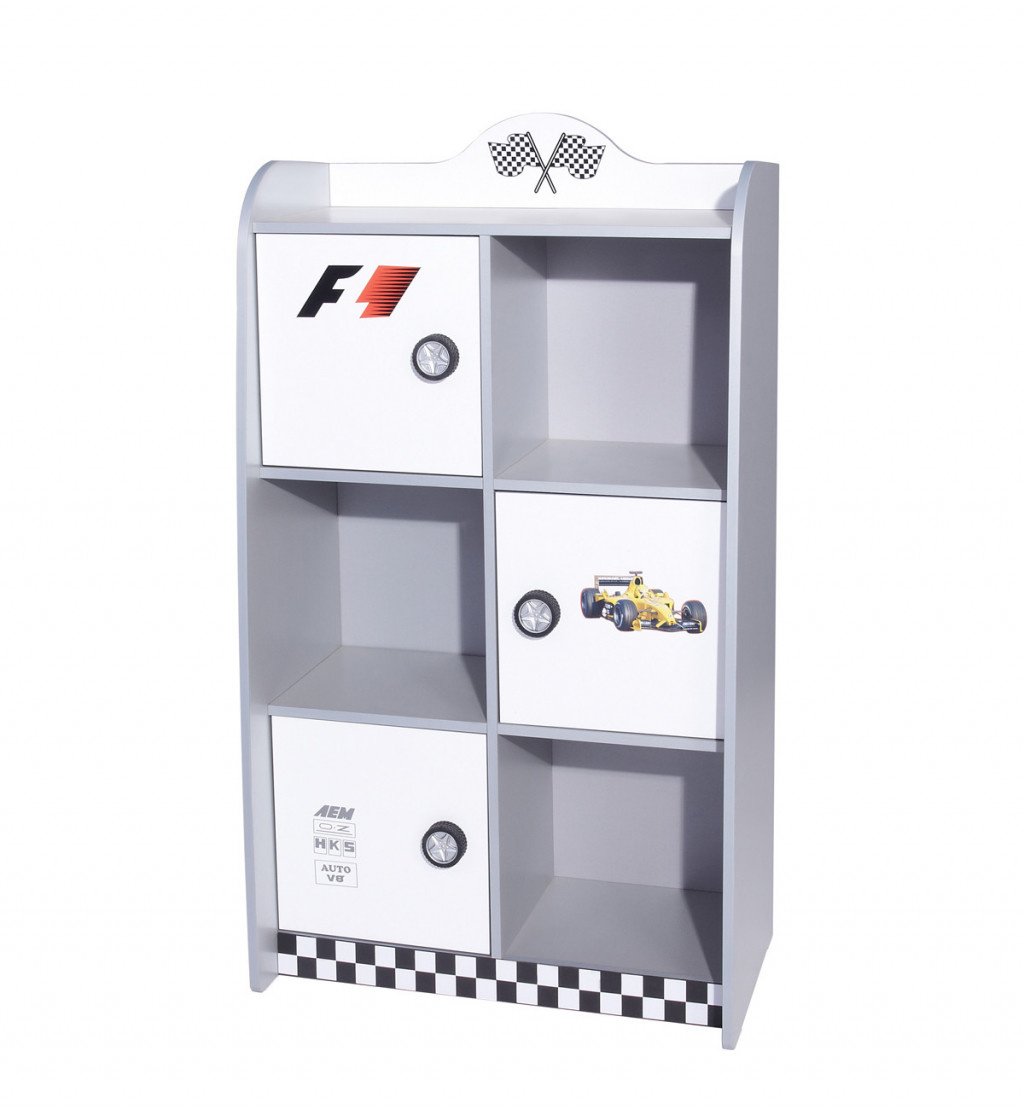 De V Power boekenkast is voorzien van 6 schappen waarvan 3 met deurtje. In de bijzet kast kan kleding opgeborgen worden, maar ook speelgoed of boeken. De auto prenten op het witte kastje geven de kast een stoere uitstraling voor de jongenskamer!